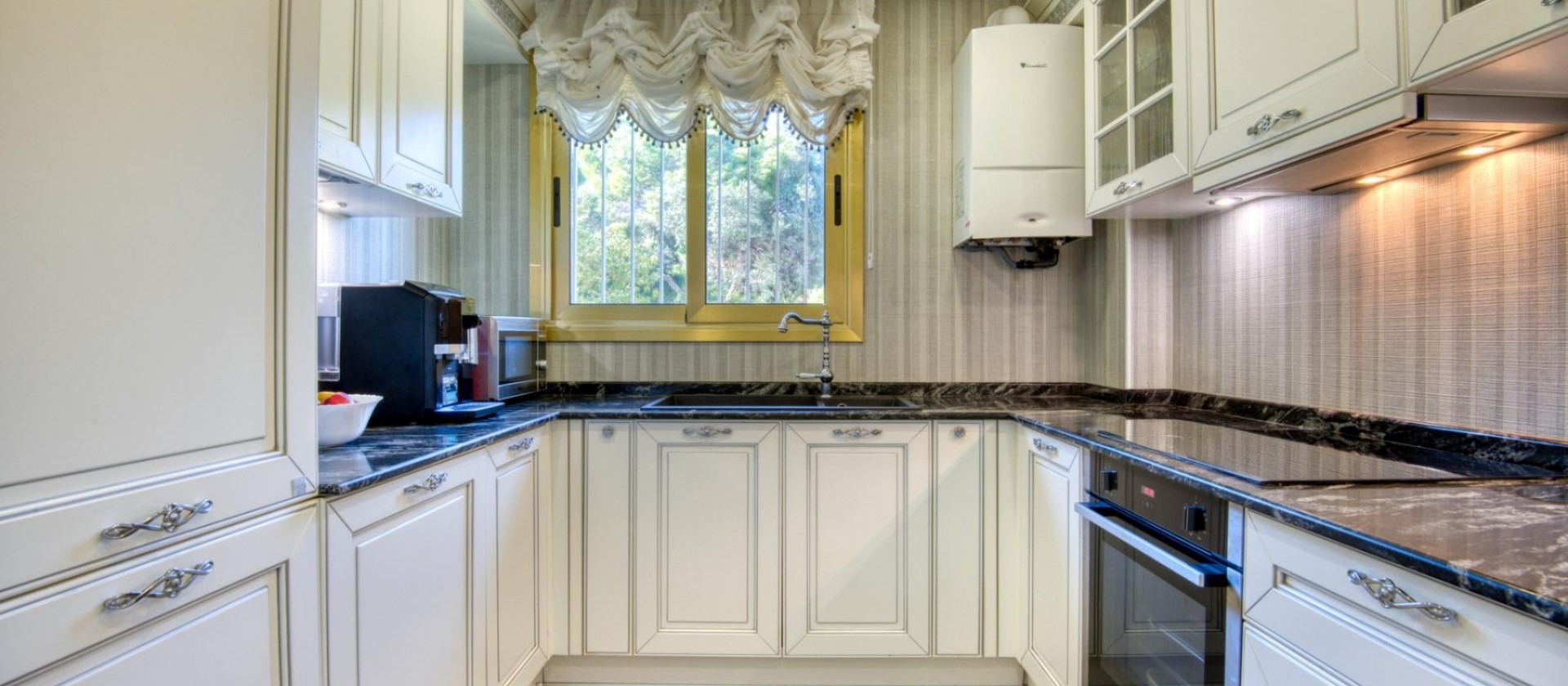 La cocina, moderna y funcional, está completamente equipada y bañada por luz natural. El dormitorio principal, con armarios empotrados, dispone de un baño en suite y vistas directas al mar. El segundo dormitorio, también con armarios empotrados, ofrece vistas abiertas al jardín, creando un ambiente de serenidad y confort.